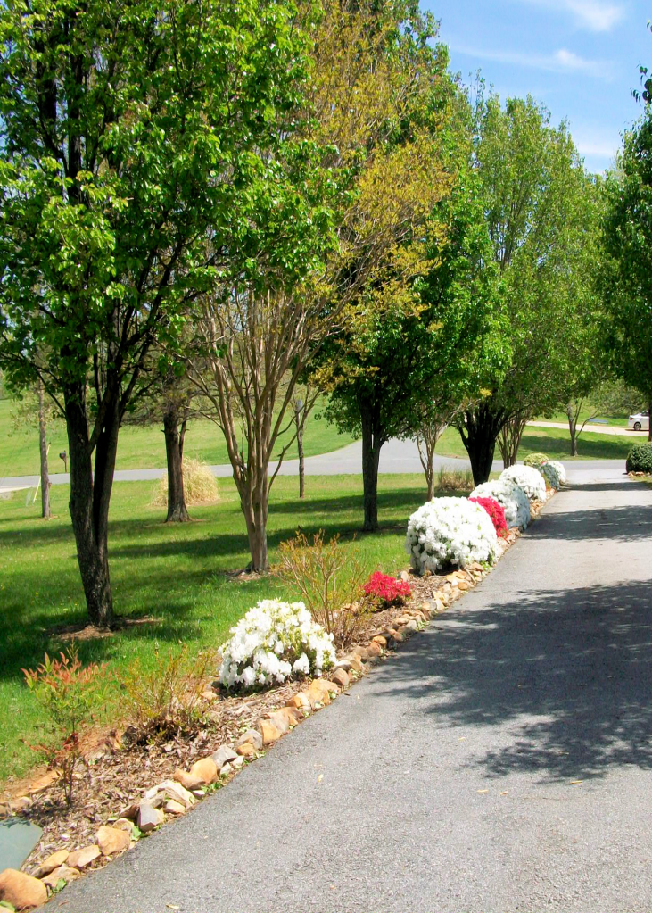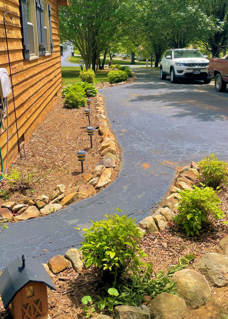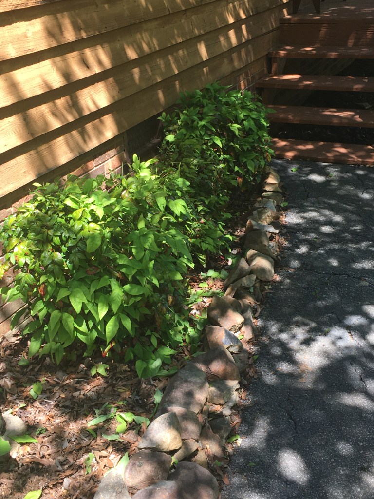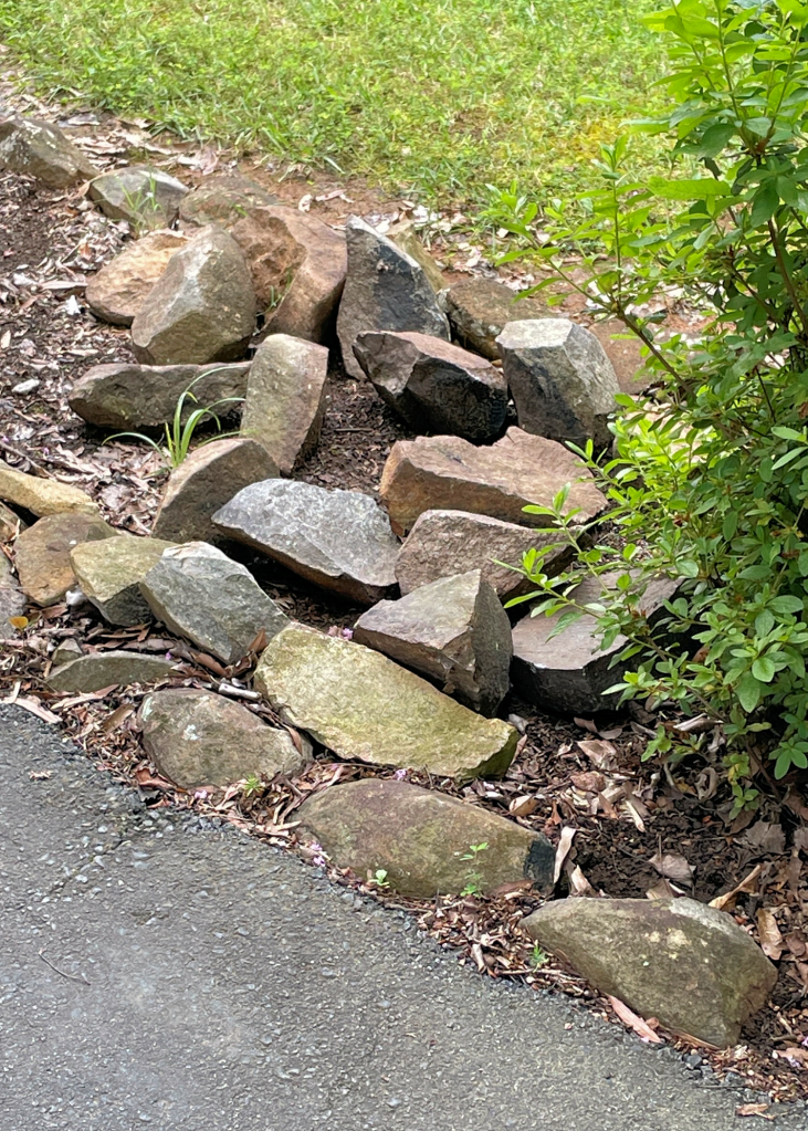 When we first moved here, thirty-plus years ago, I had a brainy idea to make a natural area down our long driveway and border it with rocks. And that’s what we did. The rocks were free, thanks to a nearby farmer, allowing us to dig up as many rocks as we wanted. And seven truckloads later, we had enough rocks piled in the yard to build a house!